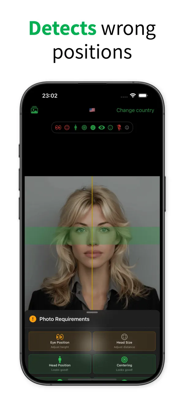 Automatic face detection, background validation, and smile and eye checks guide you to a photo that meets official rules before you export.